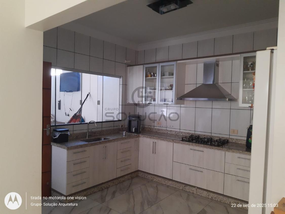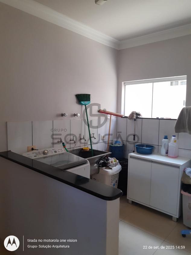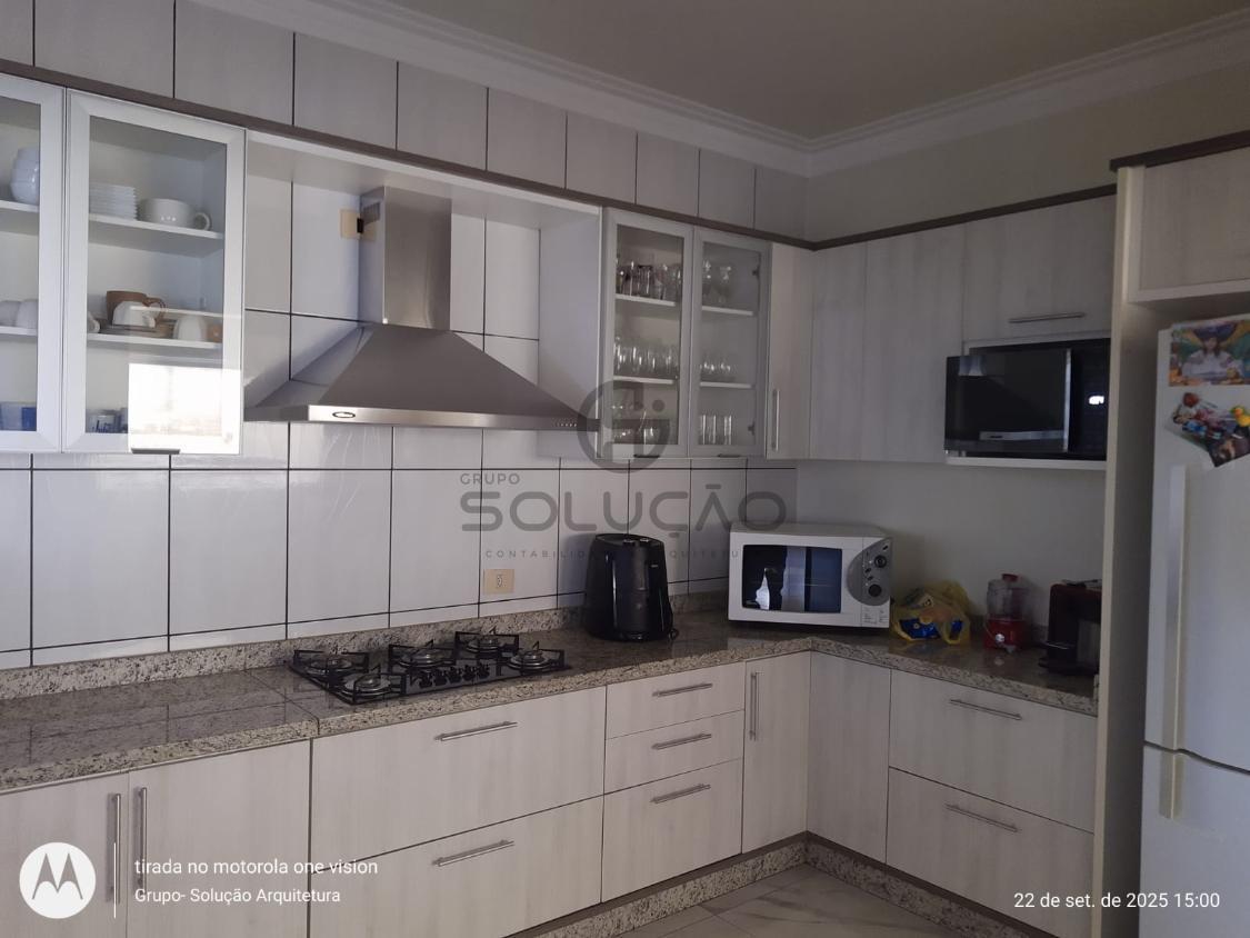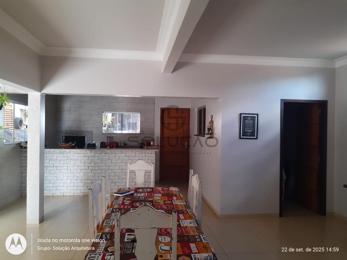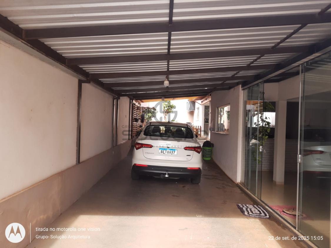 Térreo: Garagem para 02 veículos (coberta) mais 03 vagas descobertas, espaço de convivência coberto com vigas de madeira/policarbonato, sala de estar/ jantar, cozinha, escada , banheiro social, área de lazer com churrasqueira /balcão em granito, despensa, lavabo, lavanderia, além de uma sala comercial no fundo.