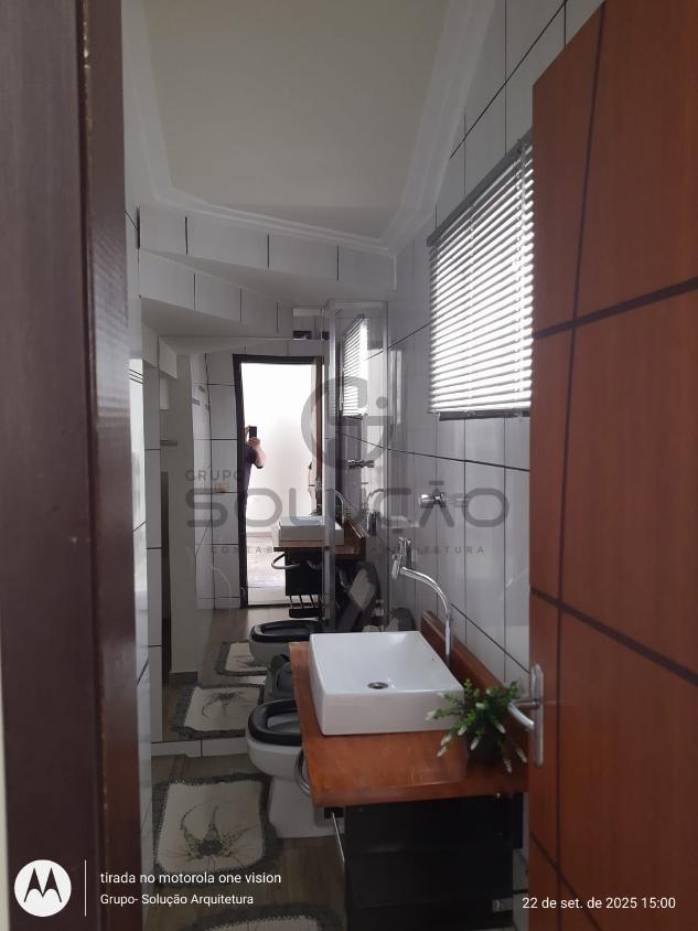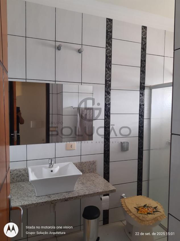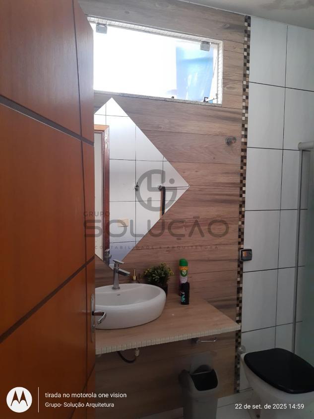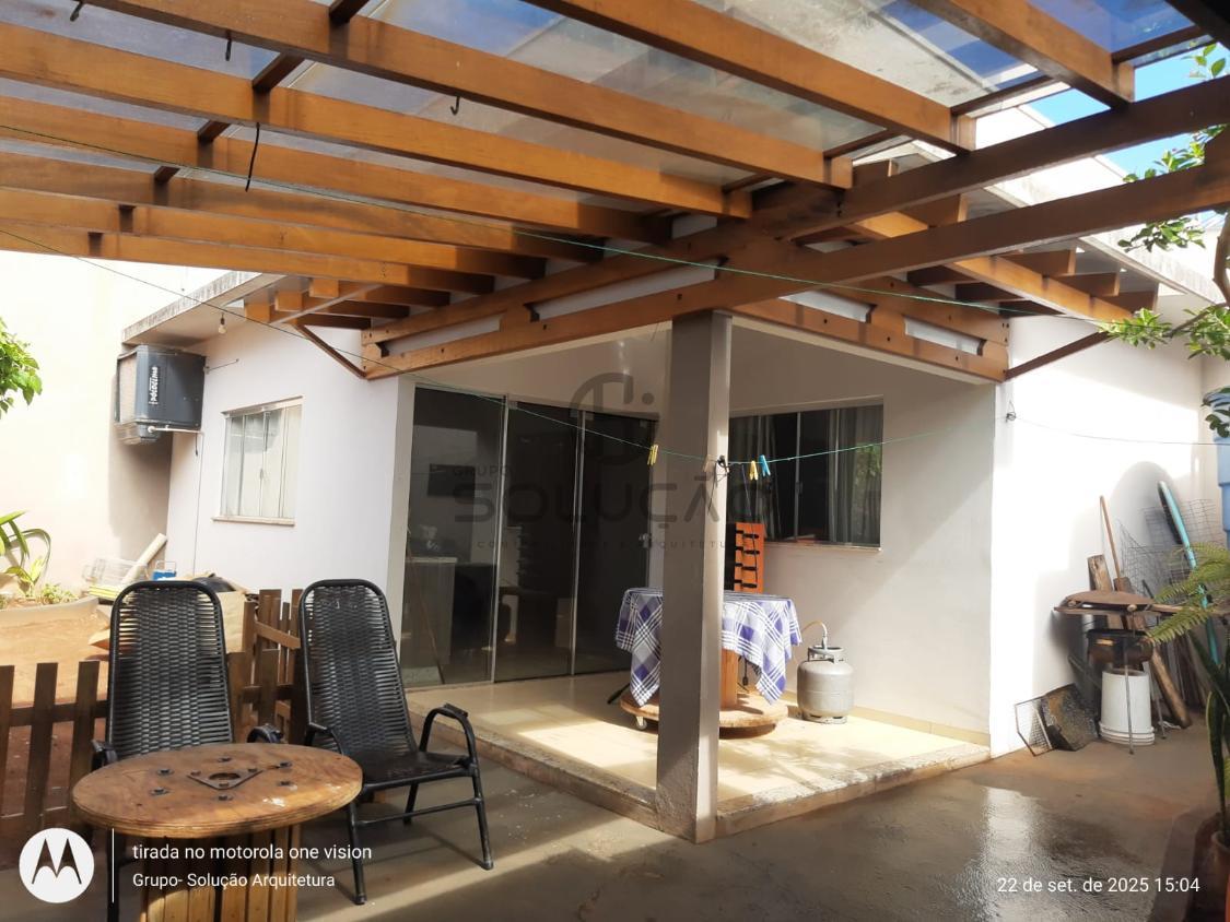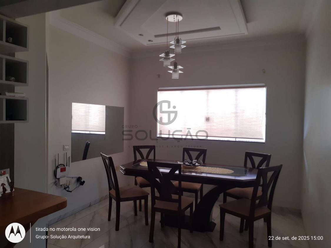 Térreo: Garagem para 02 veículos (coberta) mais 03 vagas descobertas, espaço de convivência coberto com vigas de madeira/policarbonato, sala de estar/ jantar, cozinha, escada , banheiro social, área de lazer com churrasqueira /balcão em granito, despensa, lavabo, lavanderia, além de uma sala comercial no fundo.